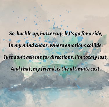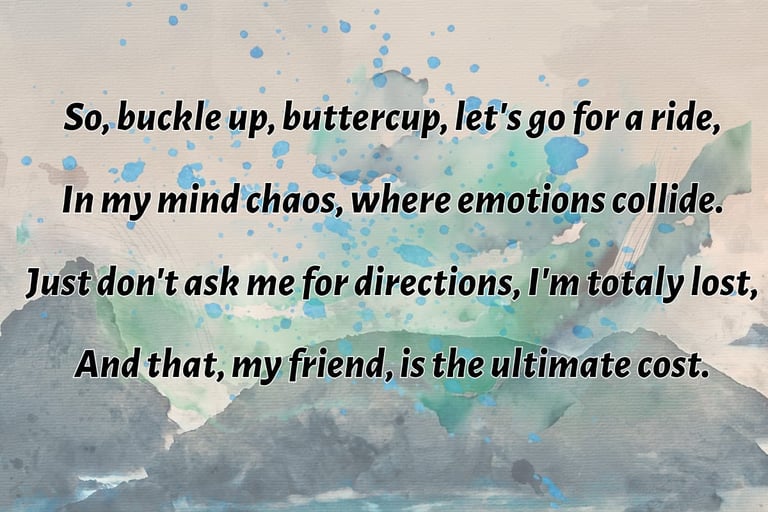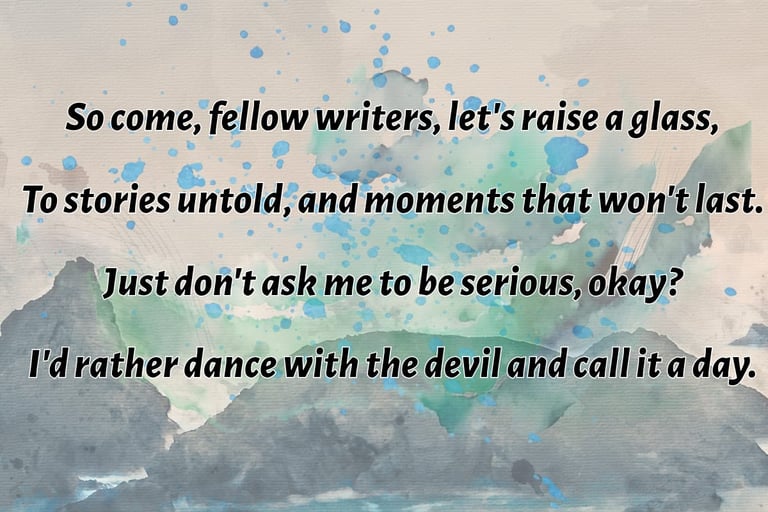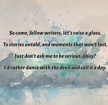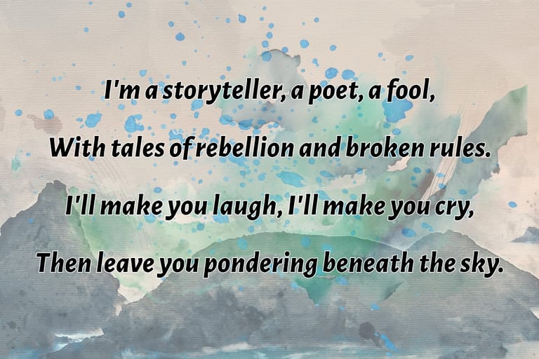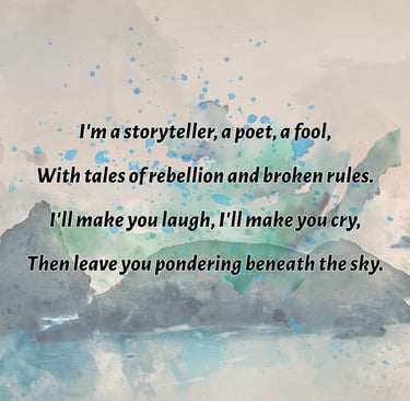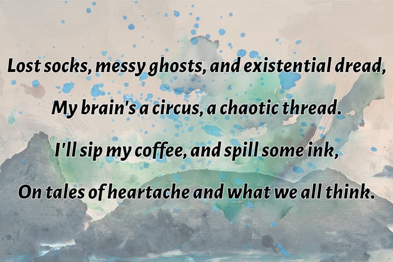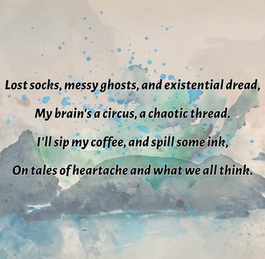 One day I'm penning about the meaning of life over wine and jazz, the next I'm crafting love songs for the brokenhearted, literally, everything from angsty poems about lost socks to philosophical rants disguised as love stories.