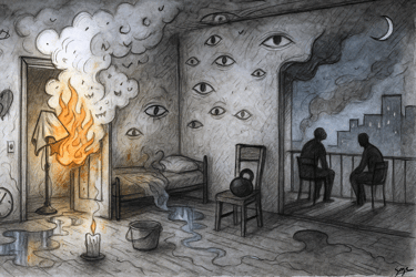 Fire was already climbing the furniture. Smoke had swallowed the ceiling. I ran for water. The electricity cut out. I was moving blind, barefoot, carrying pots and buckets in the dark, trying to find the fire through coughing and panic. I couldn't see. I couldn't breathe.